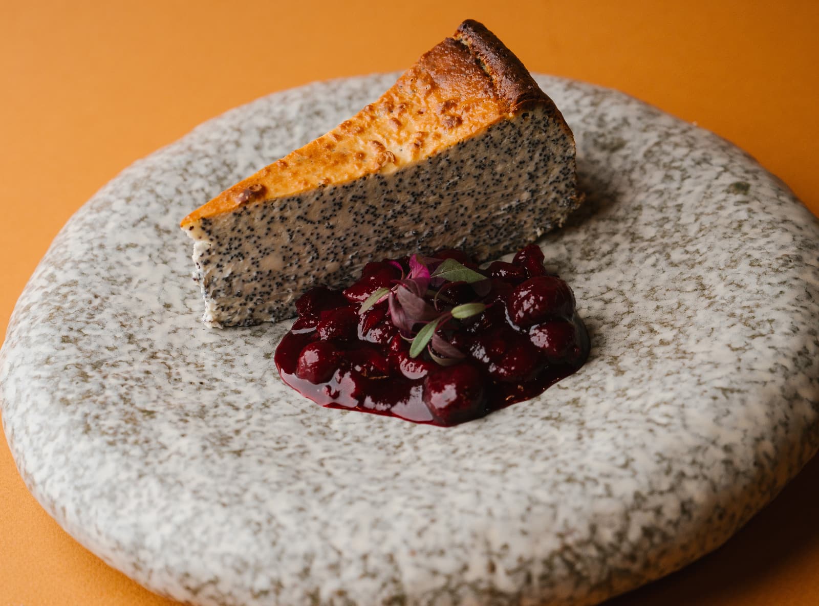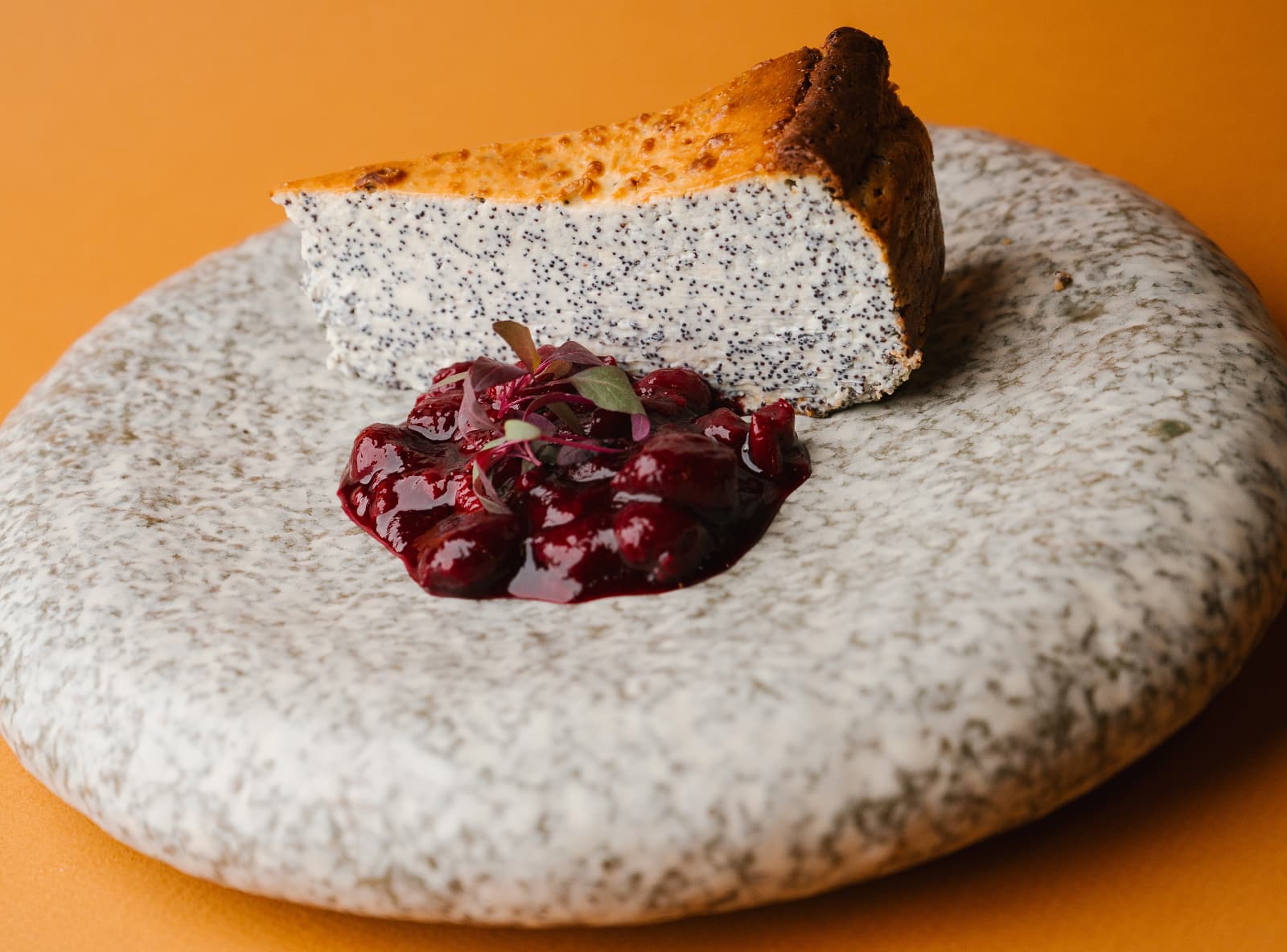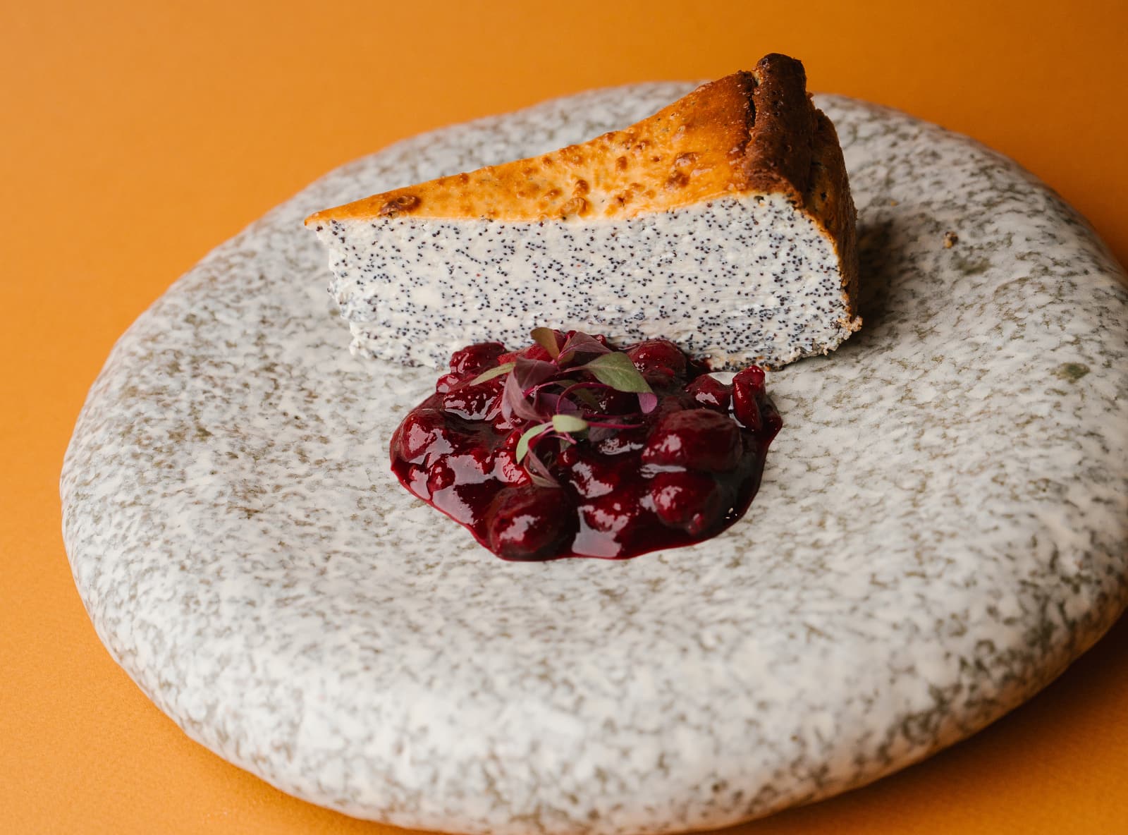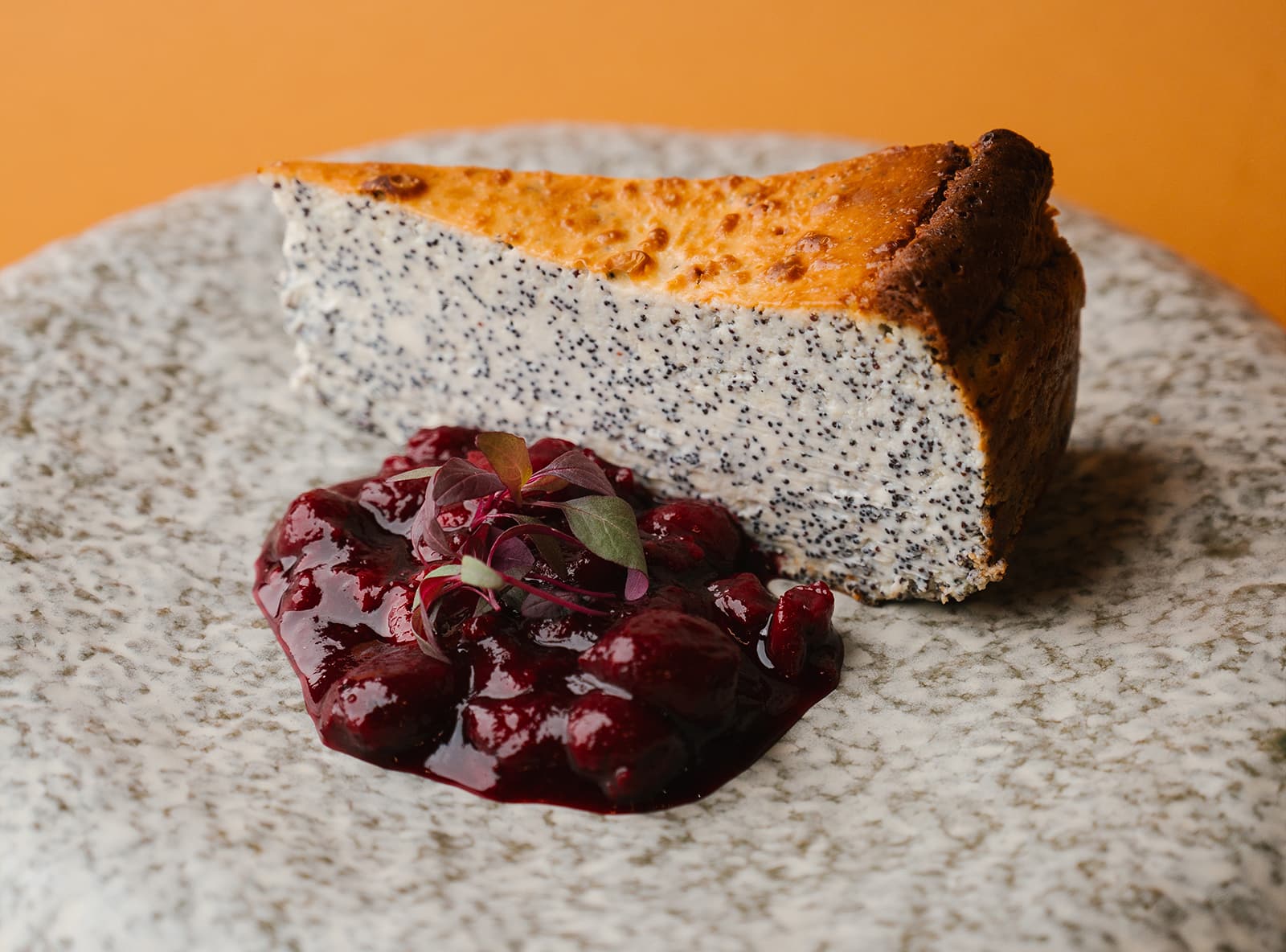 Маковый чизкейк Сан-Себастьян с вишнёвым конфи