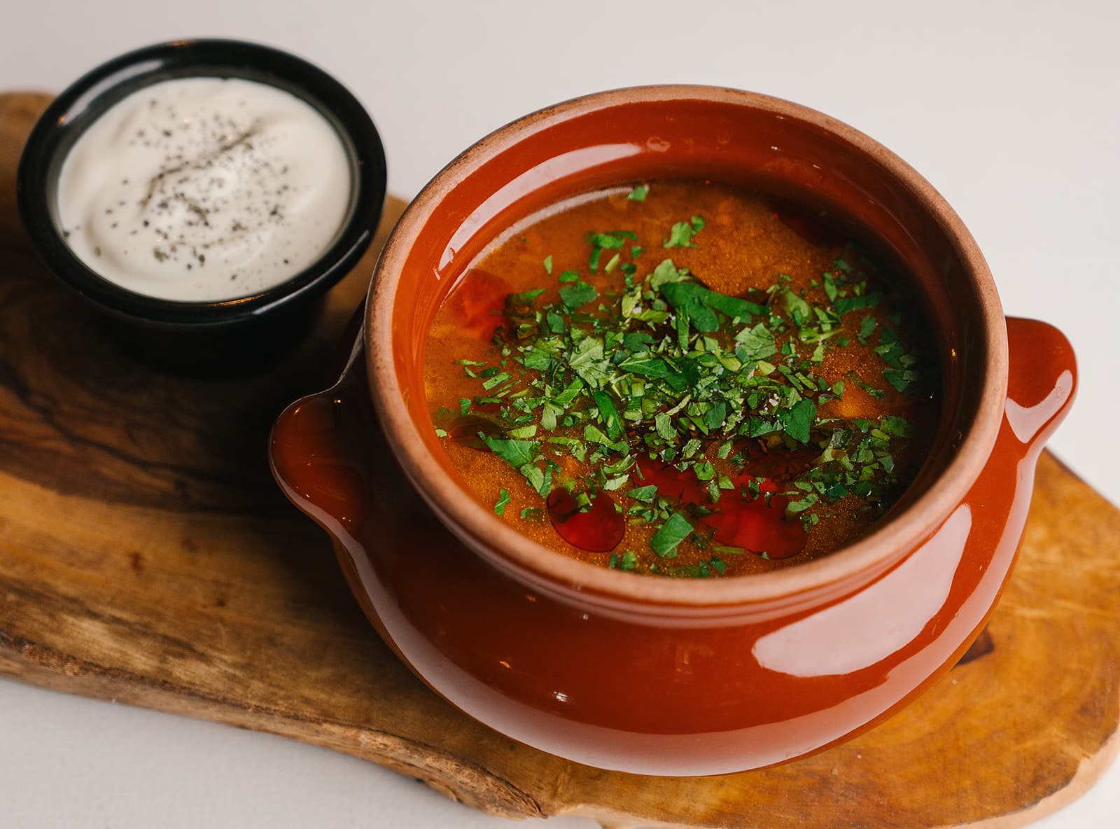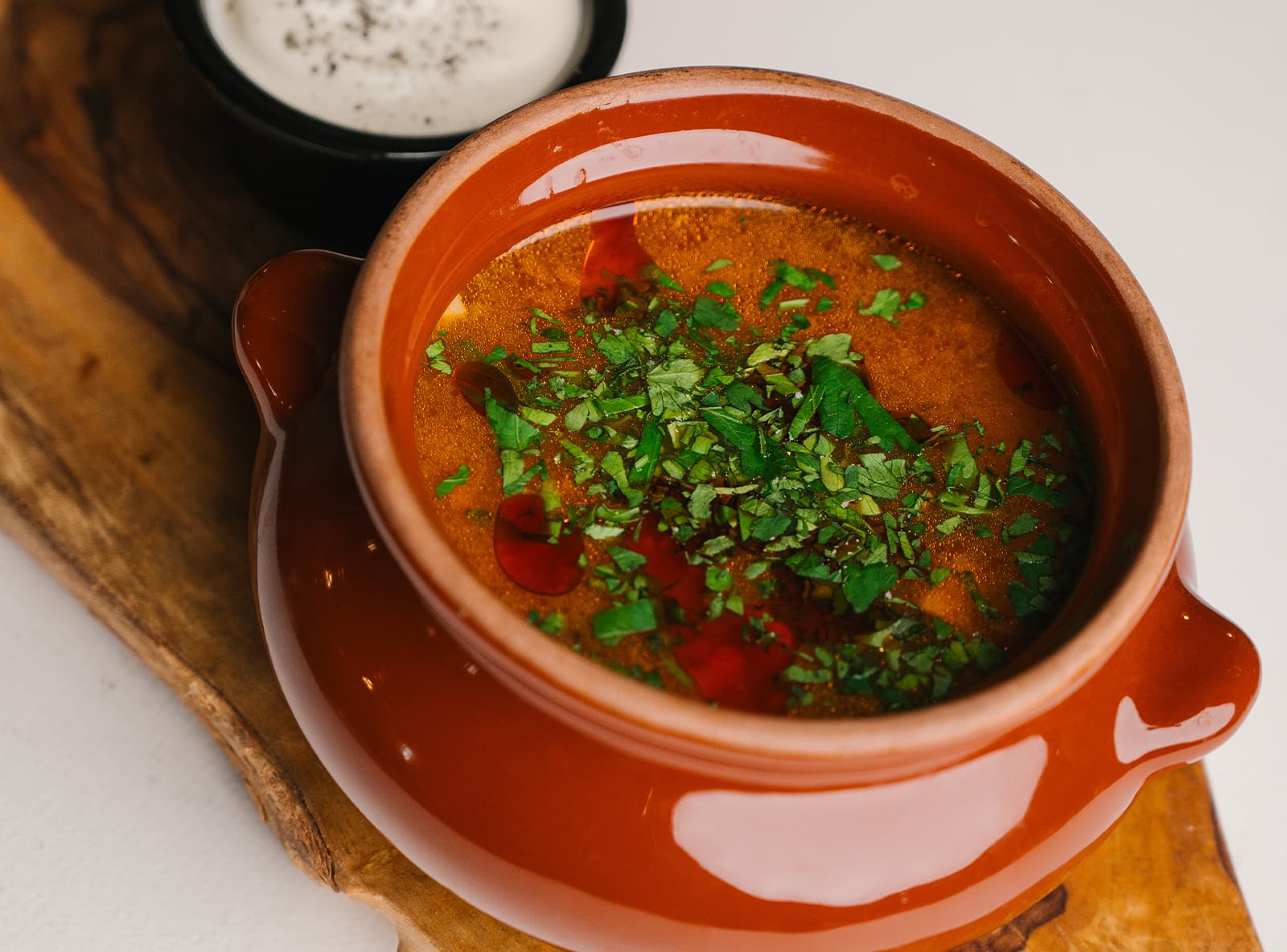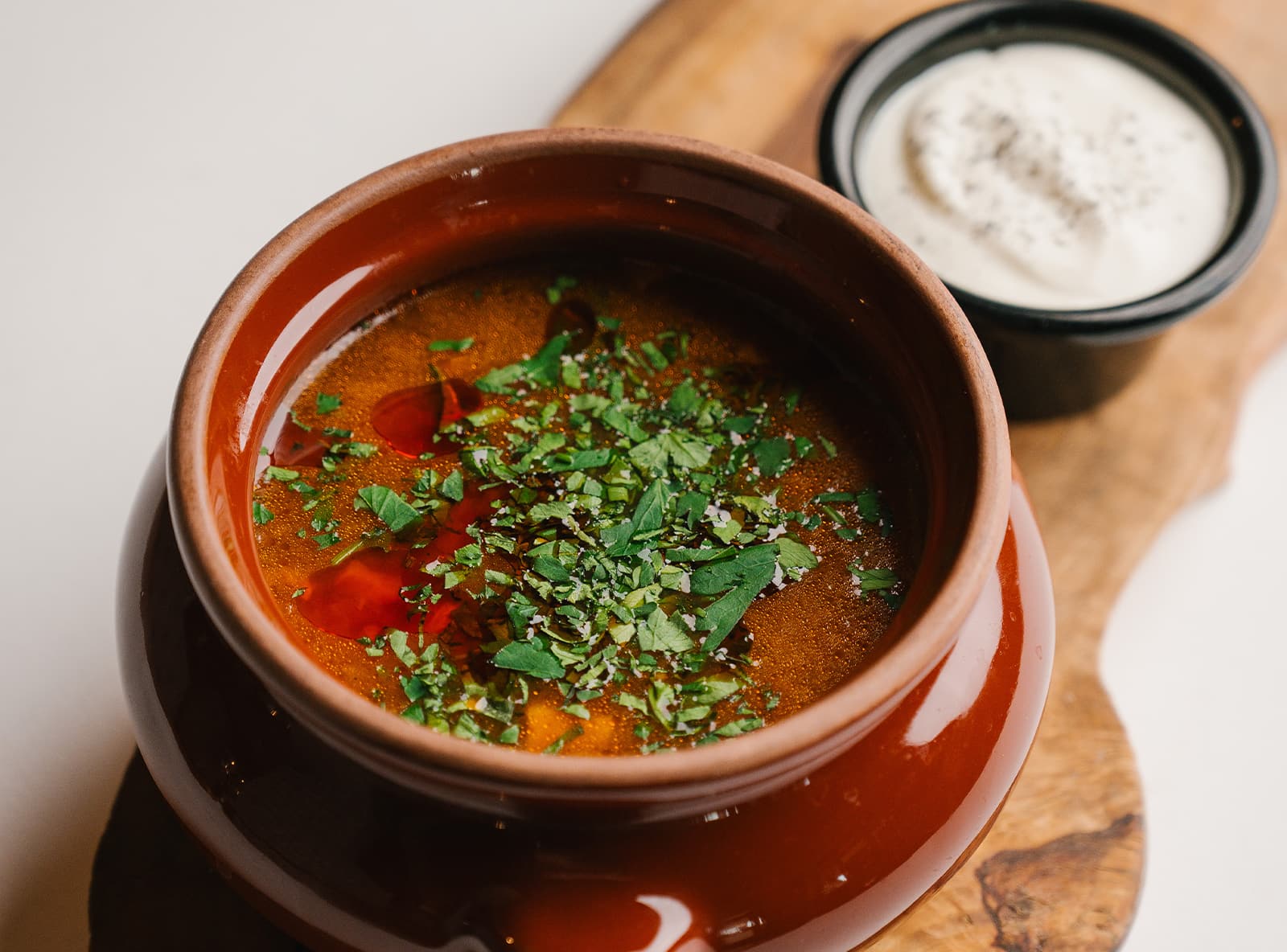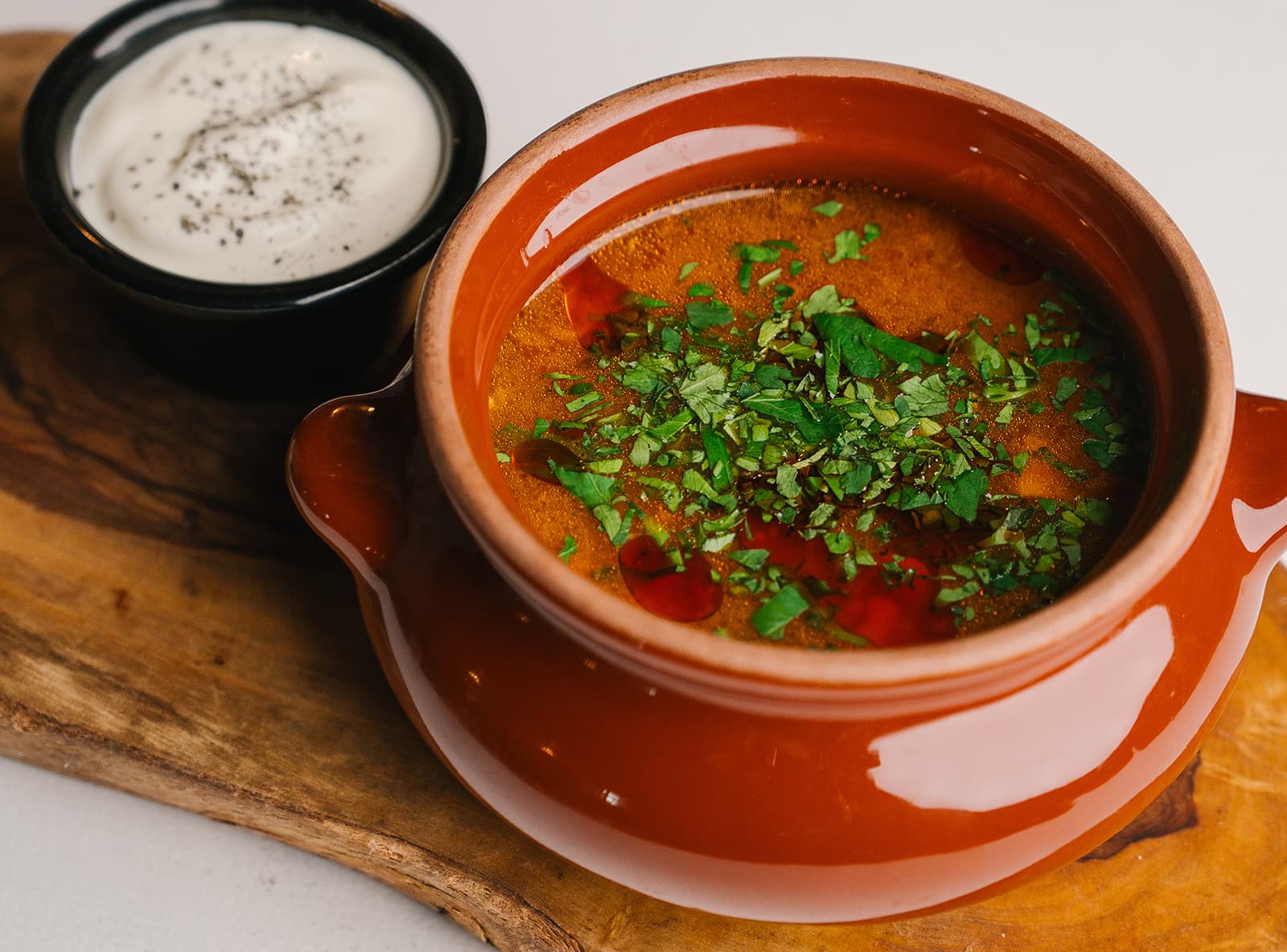 Щи «Суворовские», сваренные на копчёной грудинке с белыми грибами и сметаной
