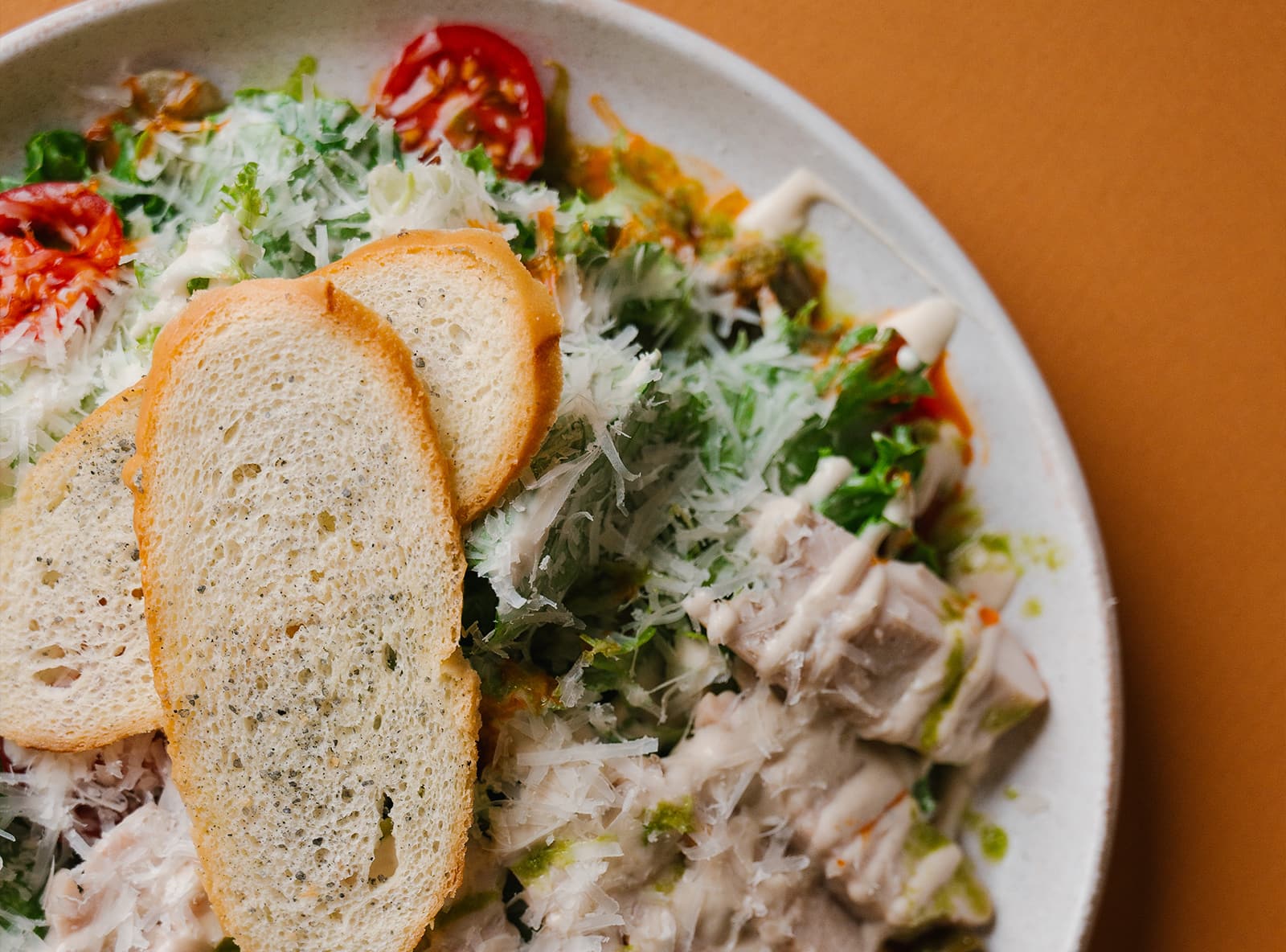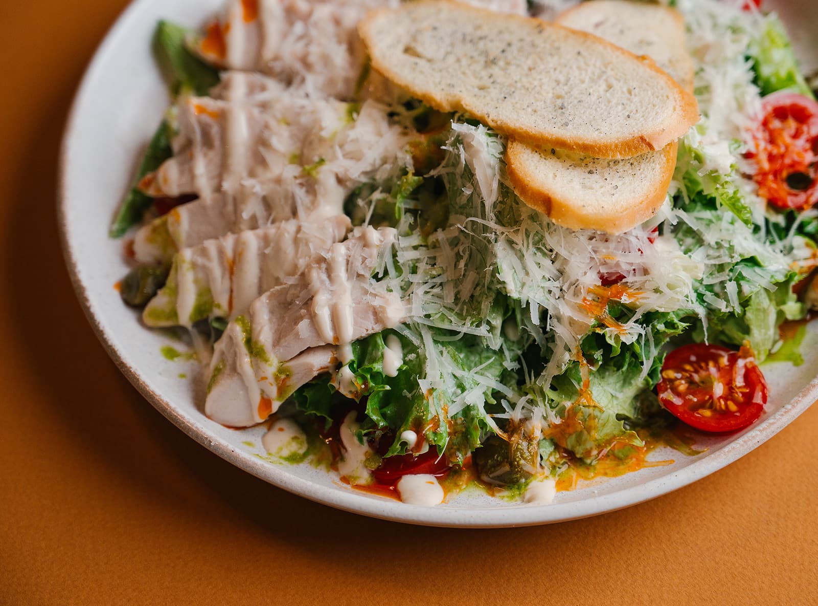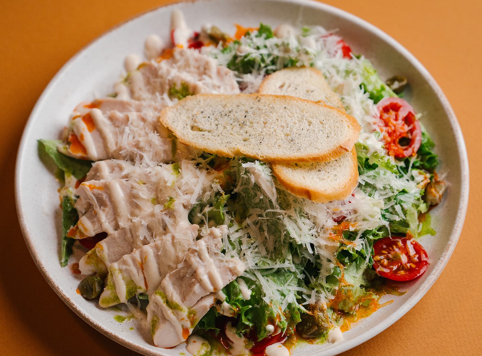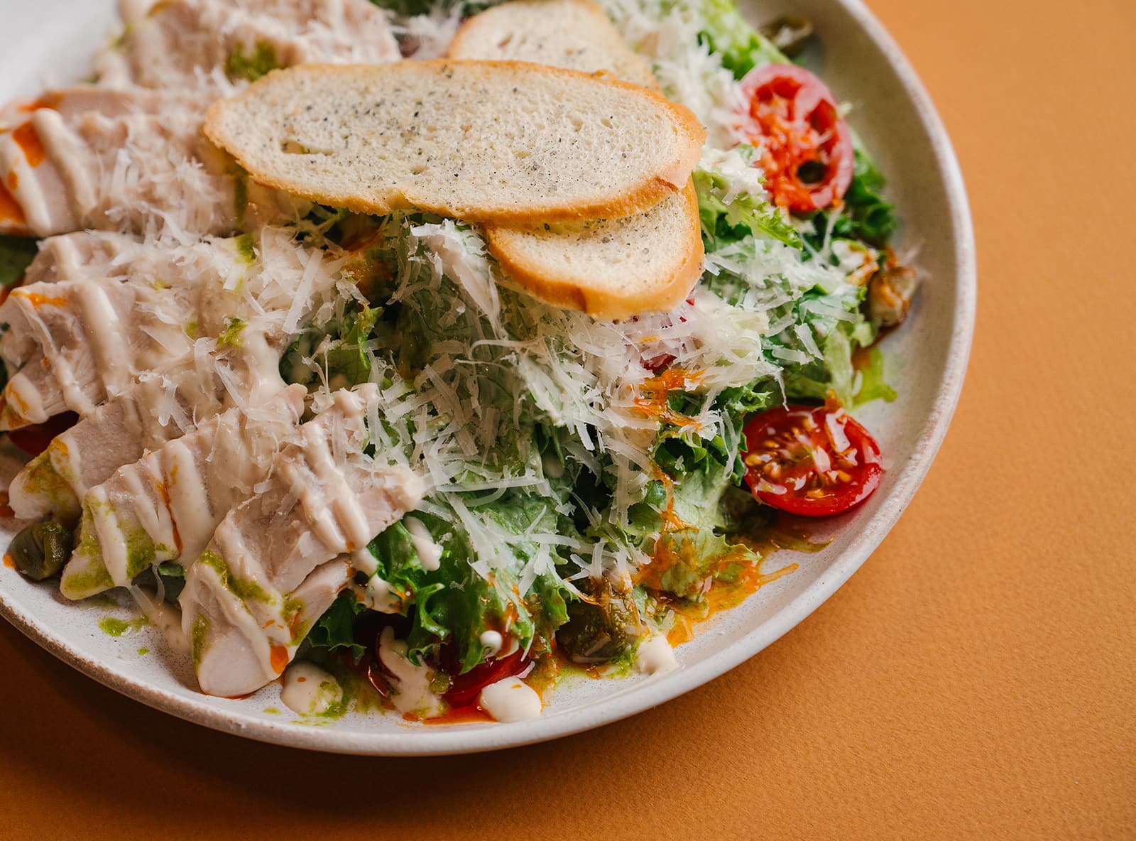 Зелёный салат с цыплёнком-гриль, каперсами, томатами и сыром Грана Падано