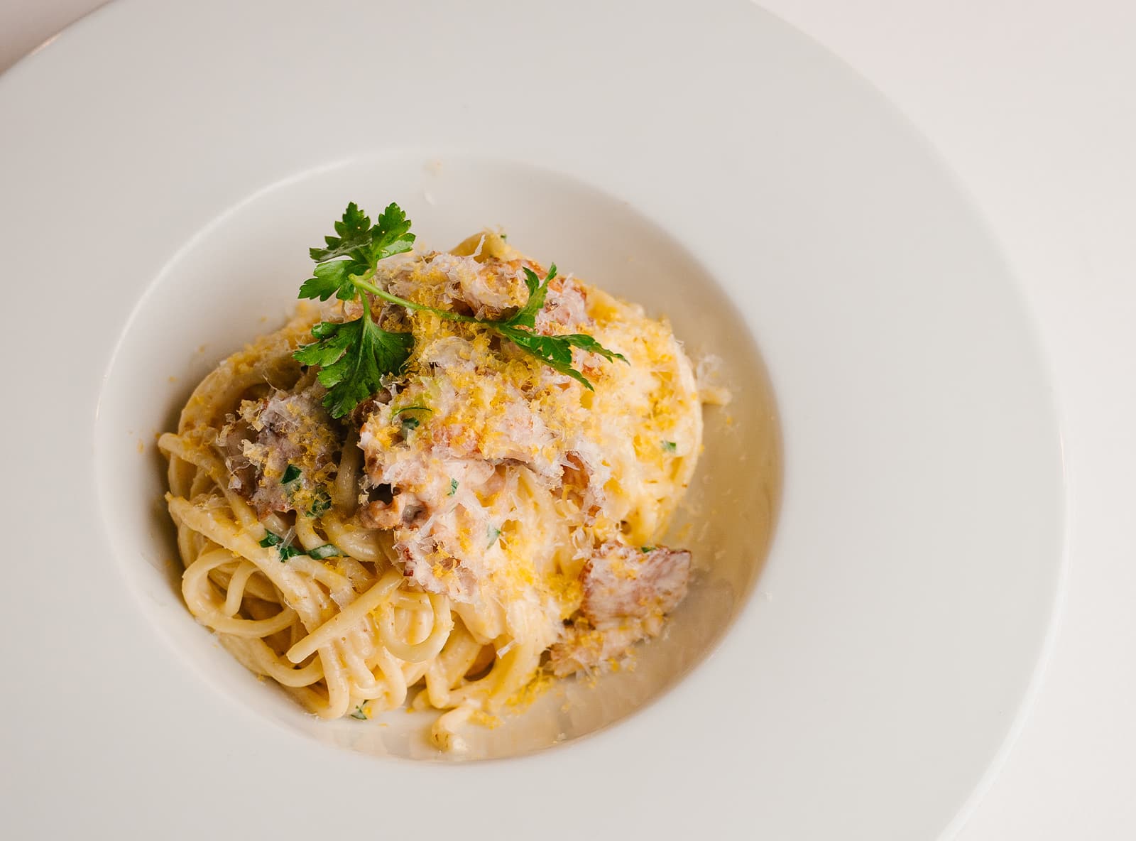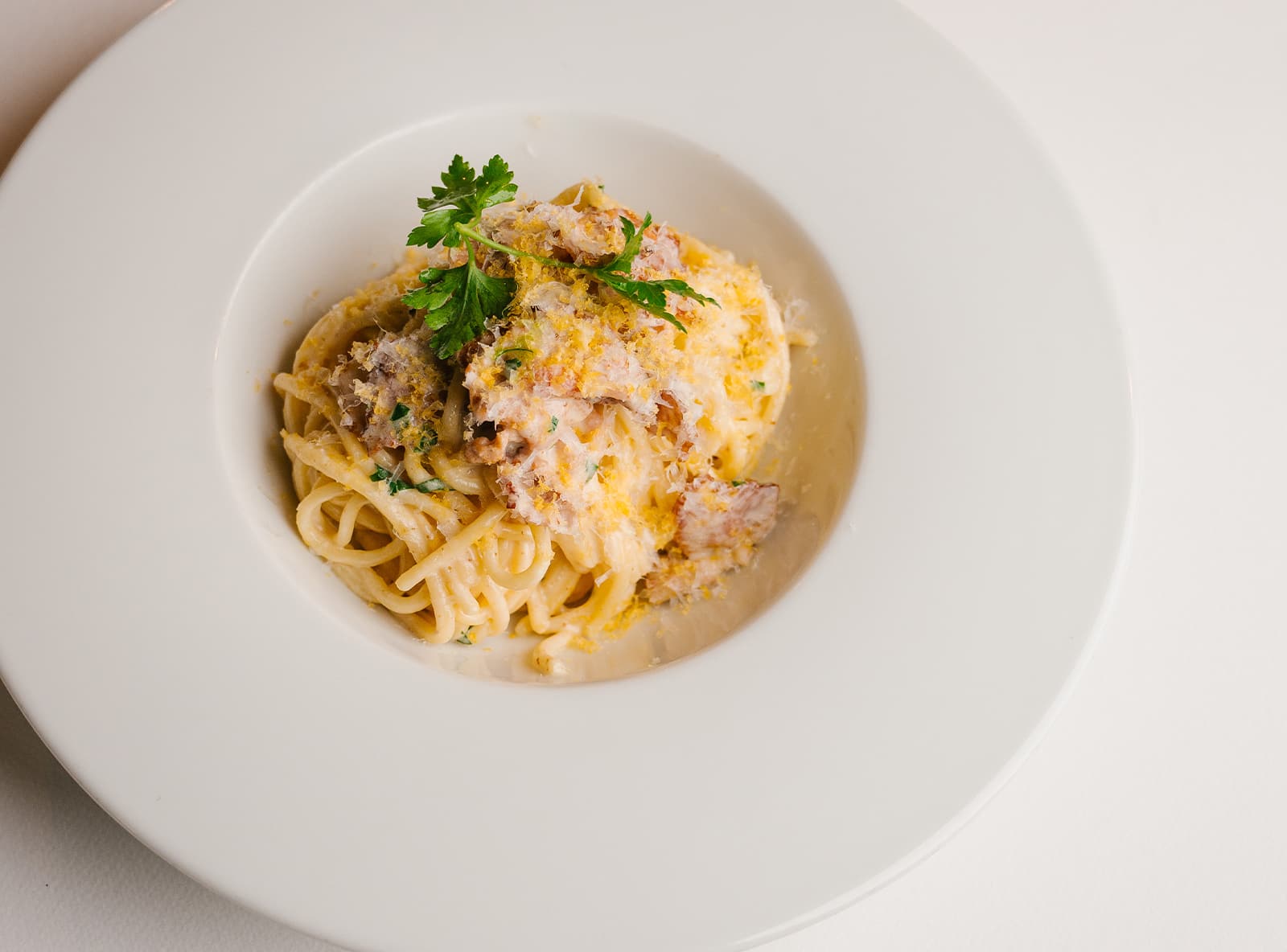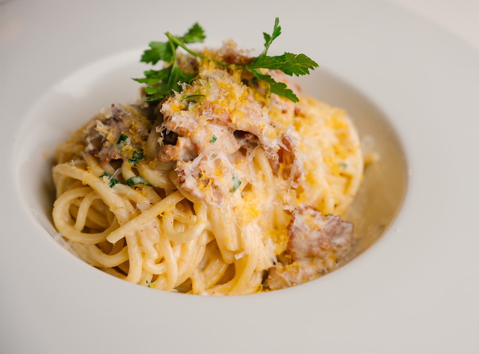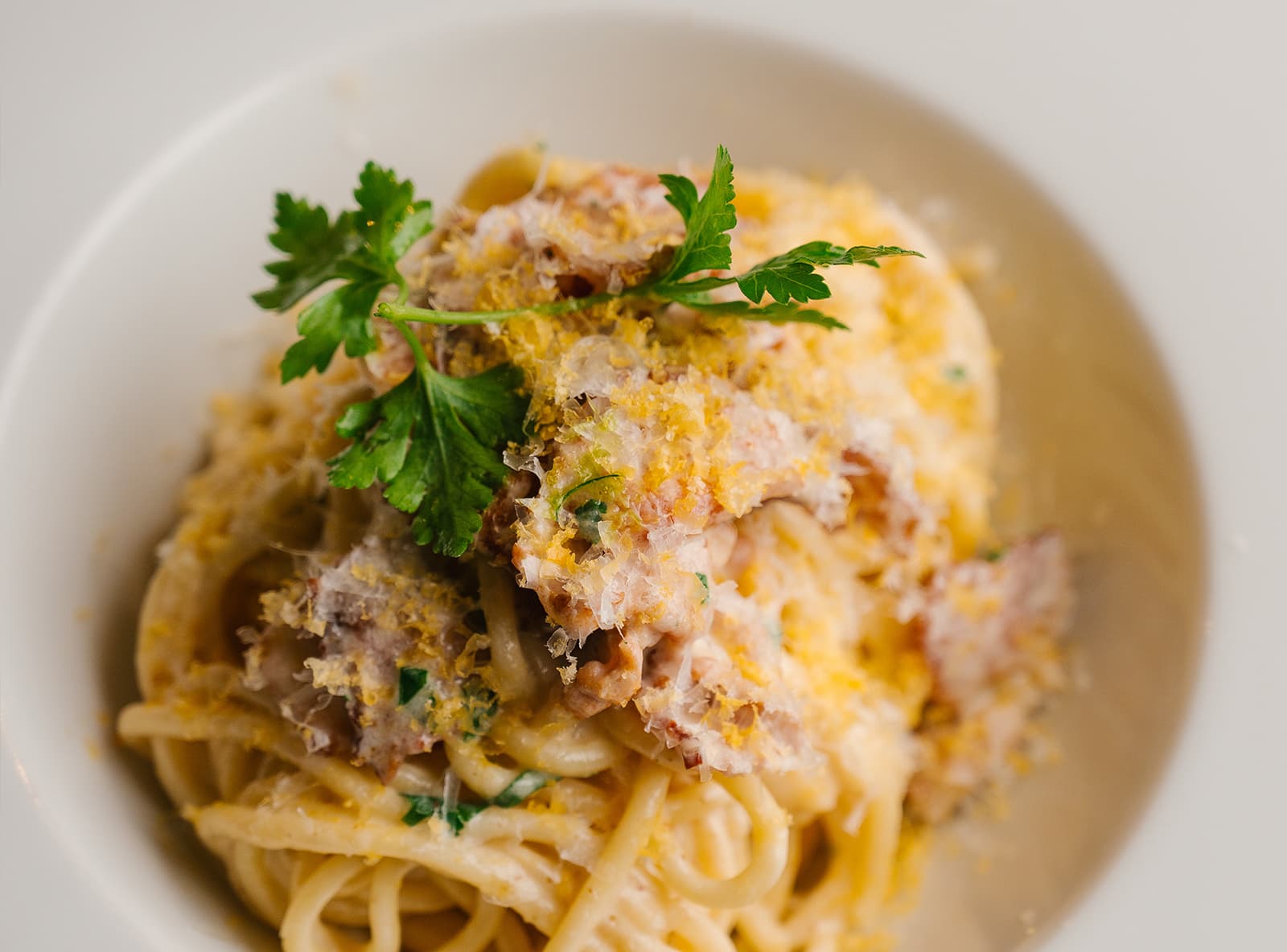 Спагетти «а-ля Карбонара» с беконом и боттаргой из желтка