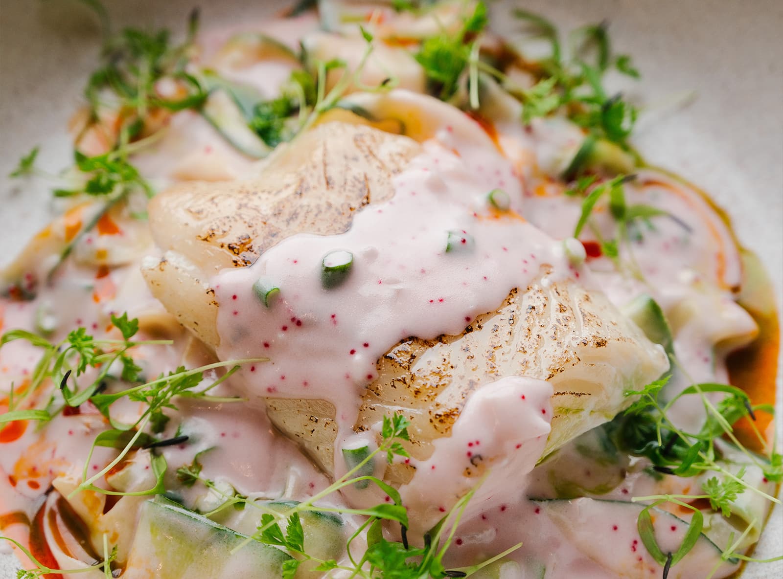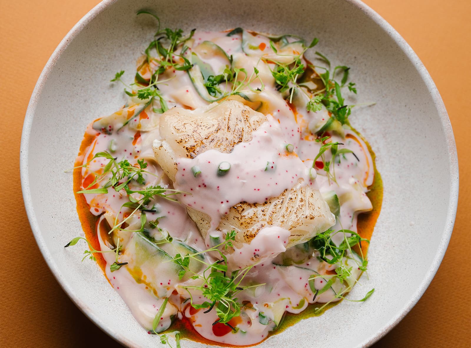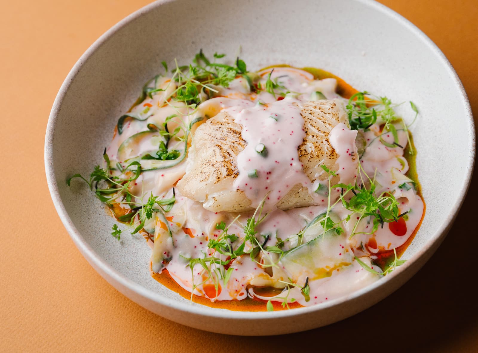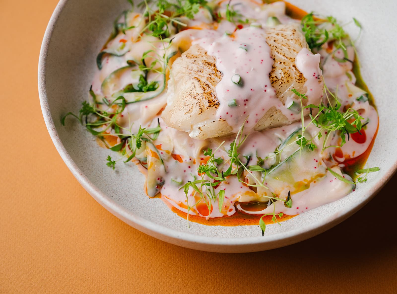 Стейк из мурманской трески с фетучини из цукини и голландским сливочно-икорным соусом