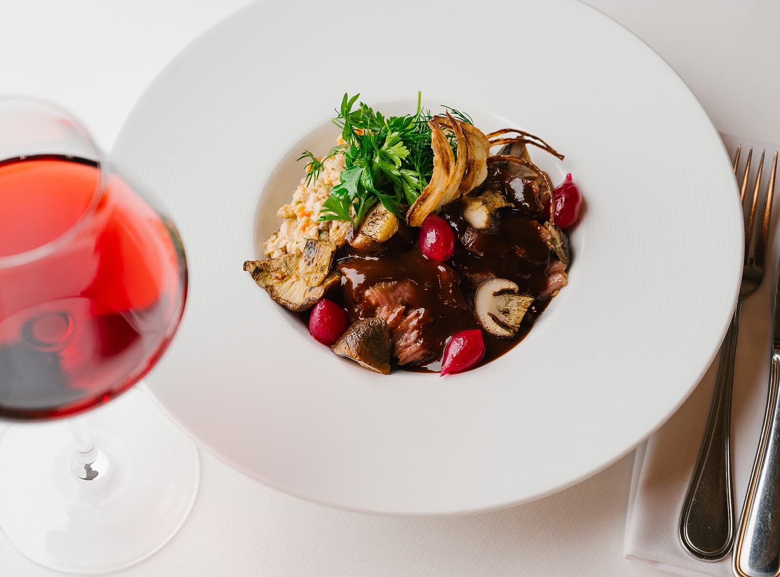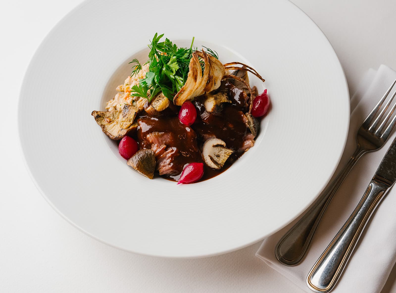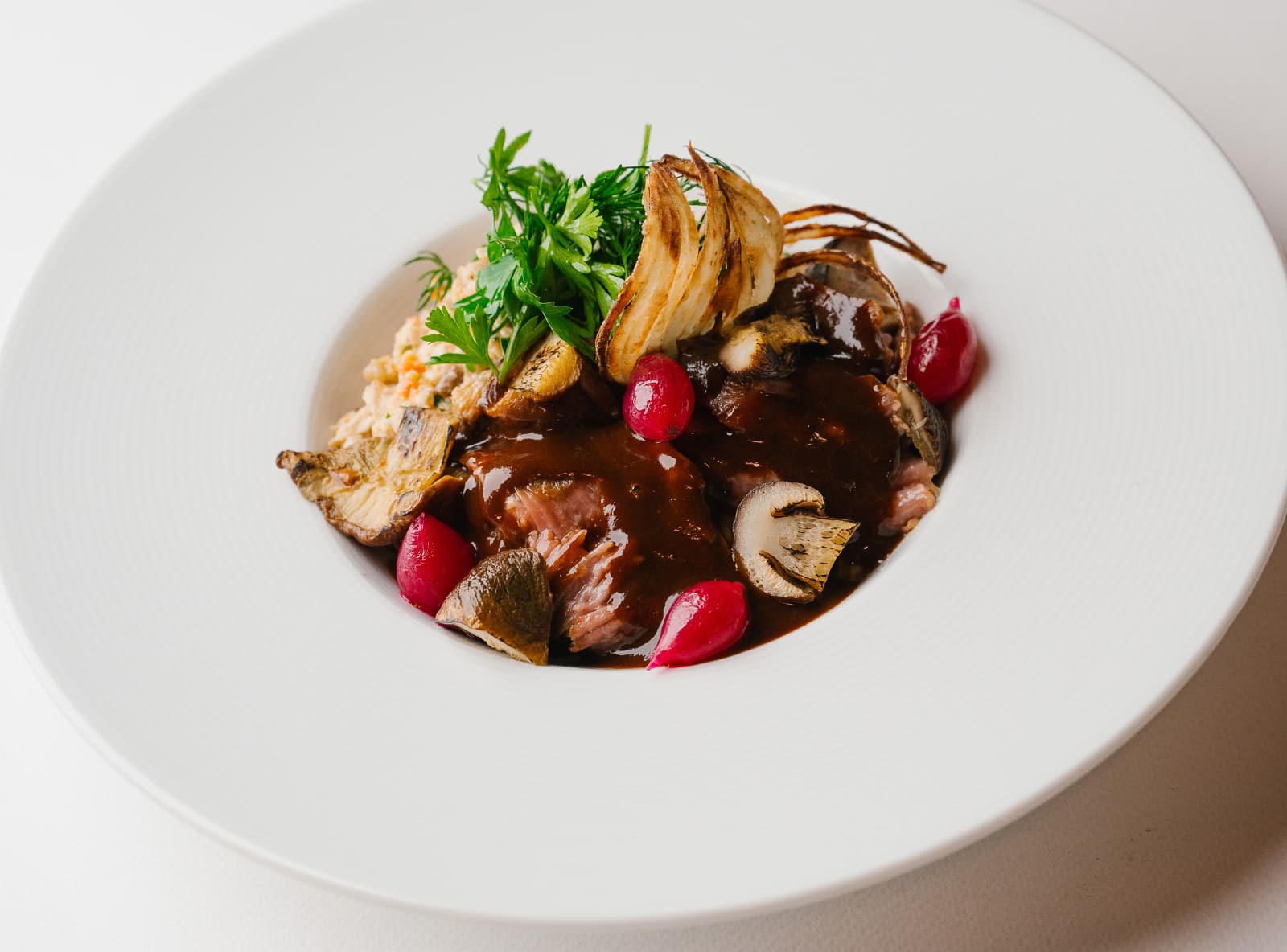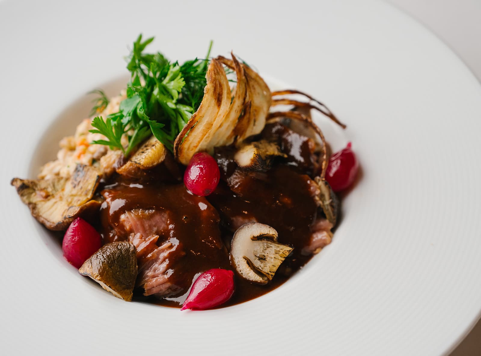 Томлёная говяжья щека с белыми грибами, кремом из печёного лука-порей и зелёной гречкой