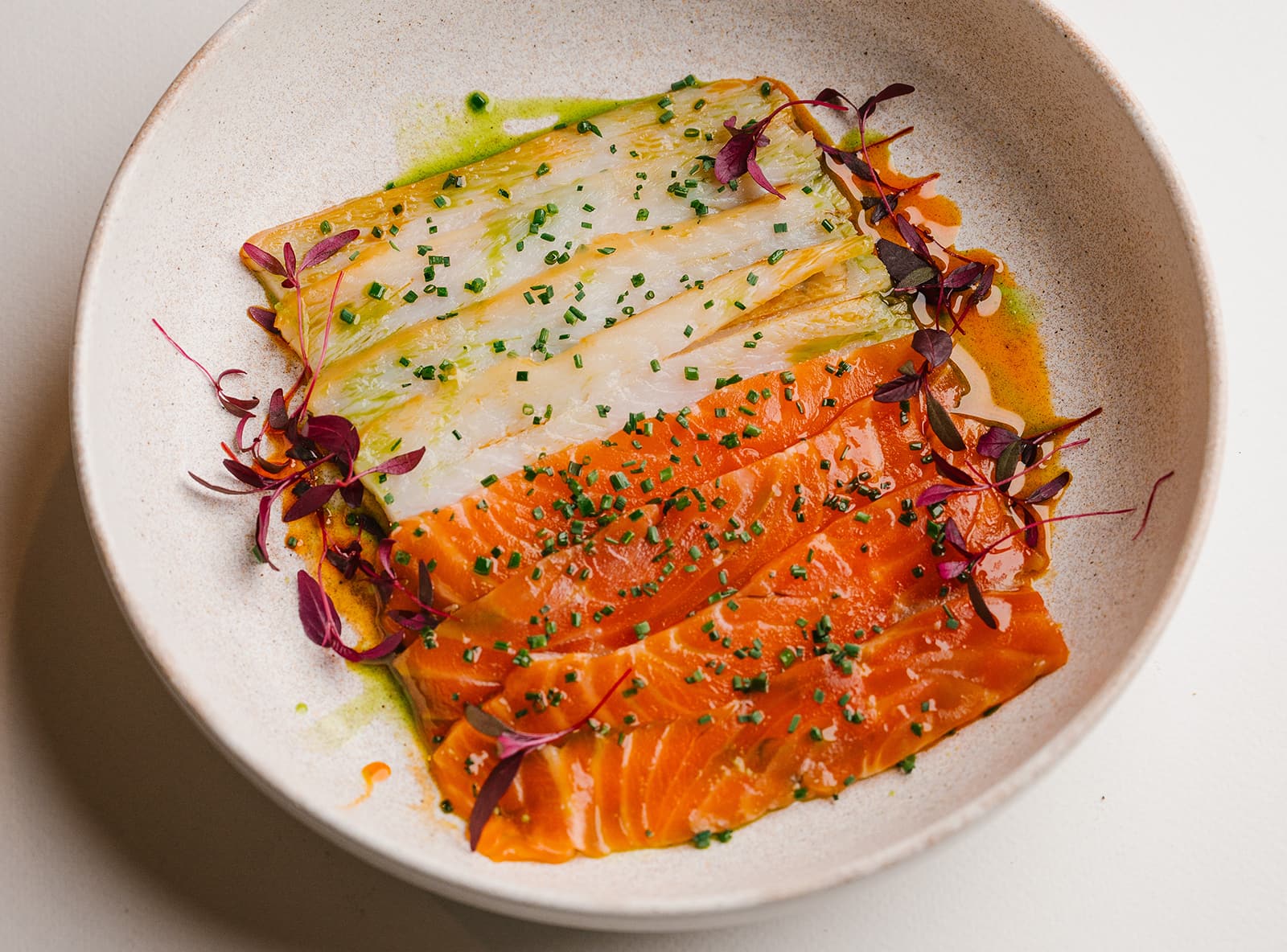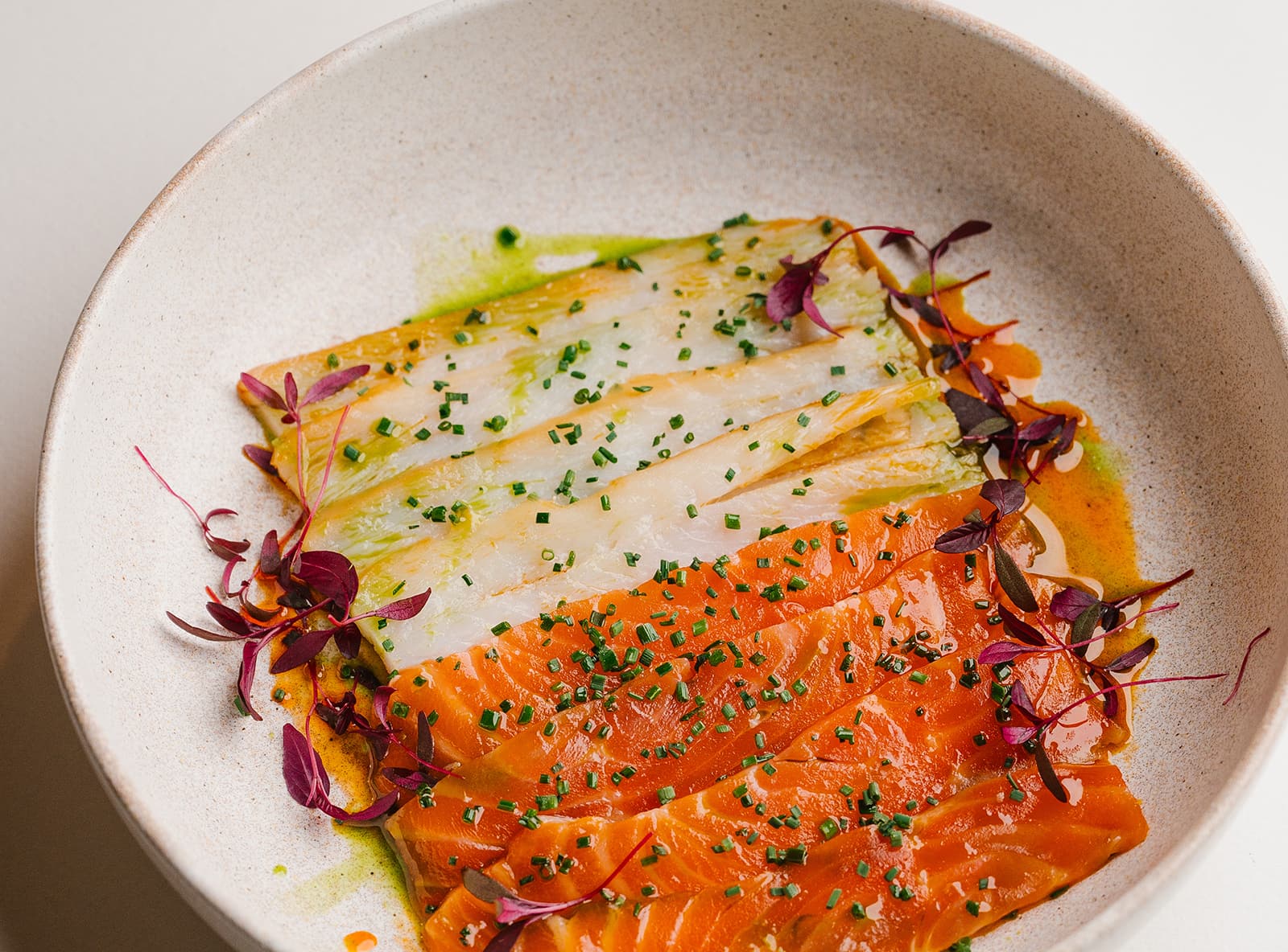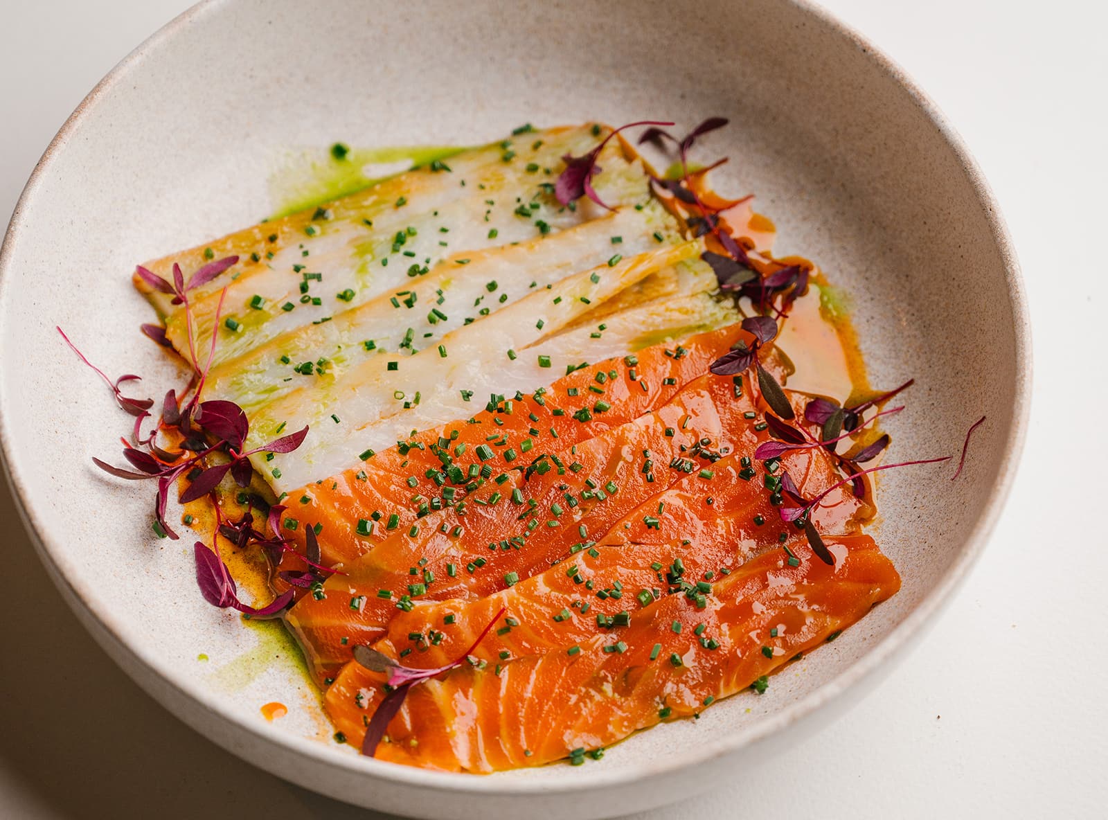 Рыбный дуэт. Лосось слабого посола и палтус, копчёный на фруктовой щепе