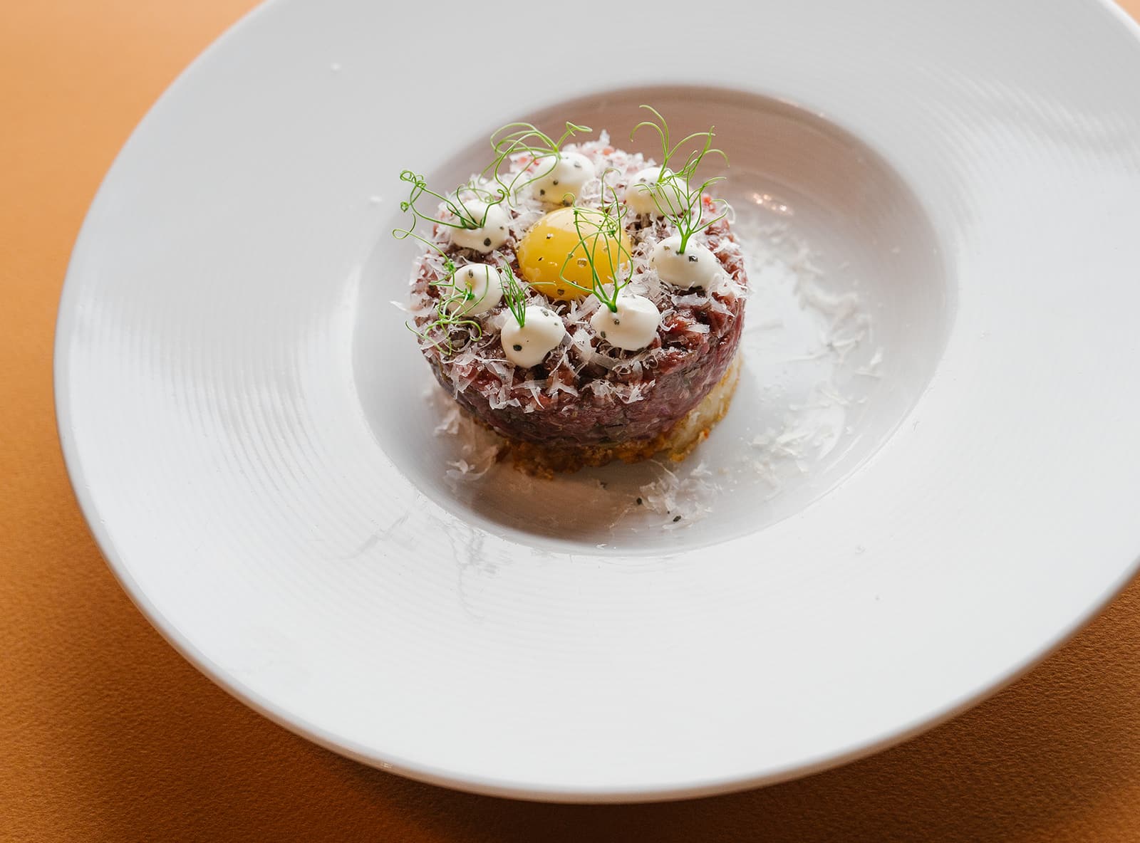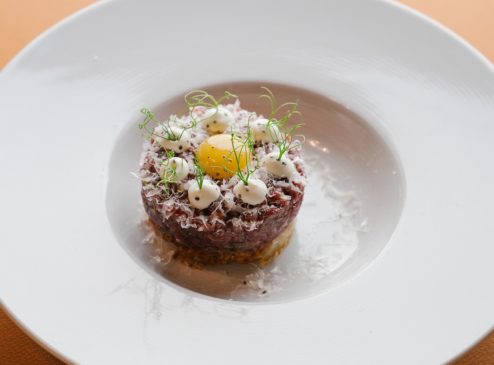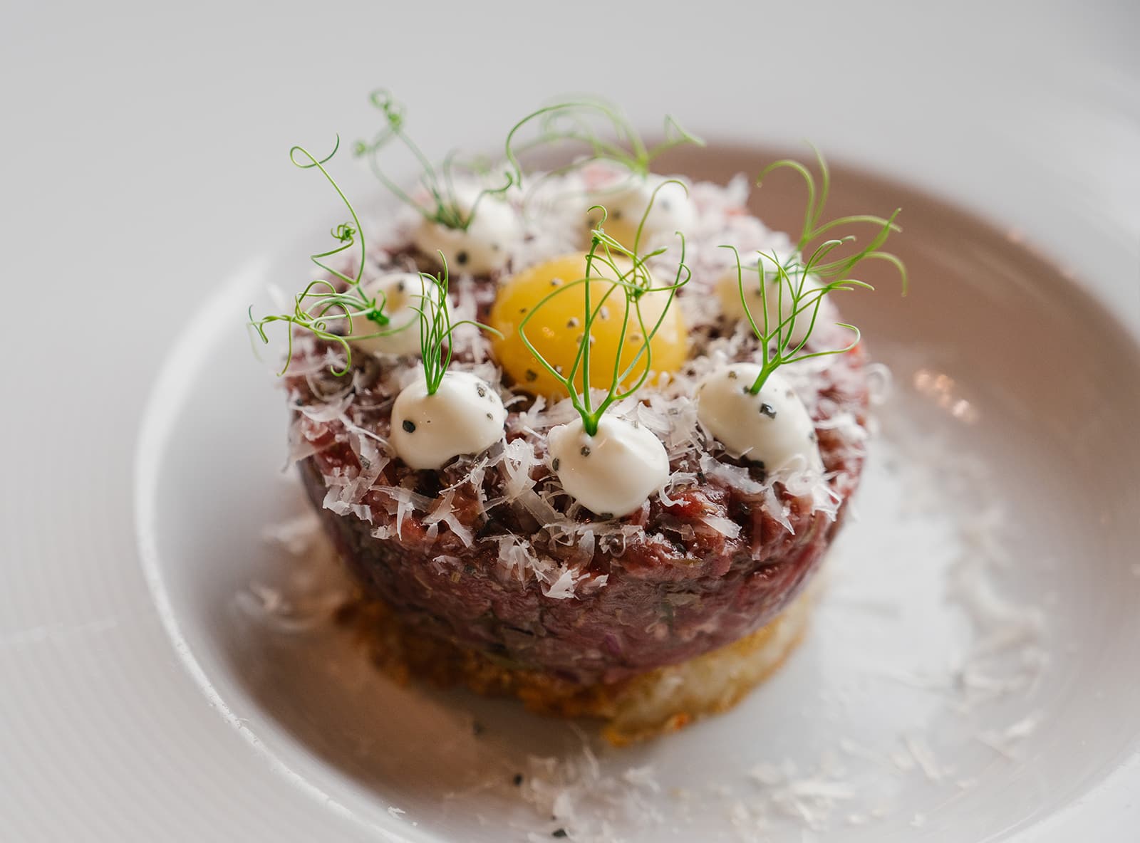 Тартар из мраморной говяжьей вырезки с трюфельным соусом на хрустящем картофеле
